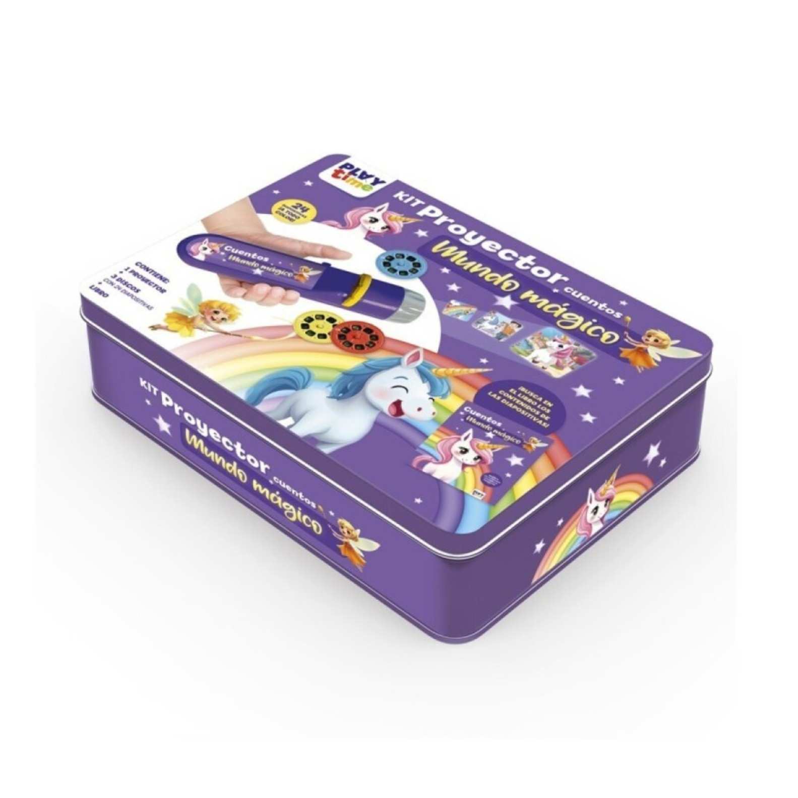 El niño disfrutará viendo proyectadas en la pared o el techo coloridas escenas de unicornios mientras escucha los cuentos. Podrá buscar y descubrir las diapositivas dentro del libro de actividades. Además, la función de linterna le permite explorar y jugar de manera creativa con la luz.