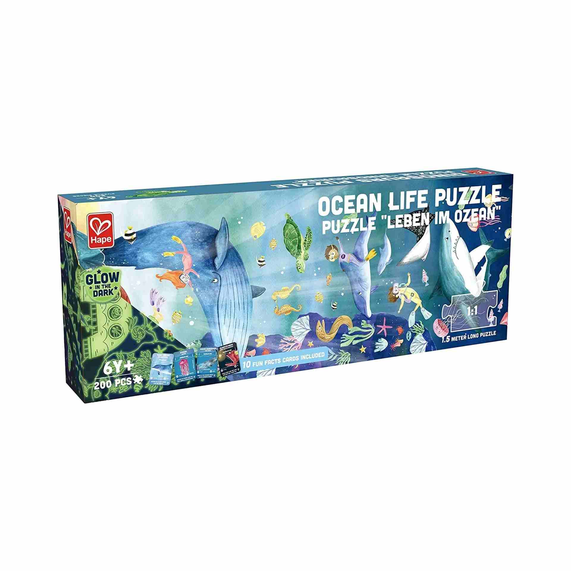 Incluye: Puzzle de 200 piezas + 10 tarjetas informativas sobre la vida marina.
